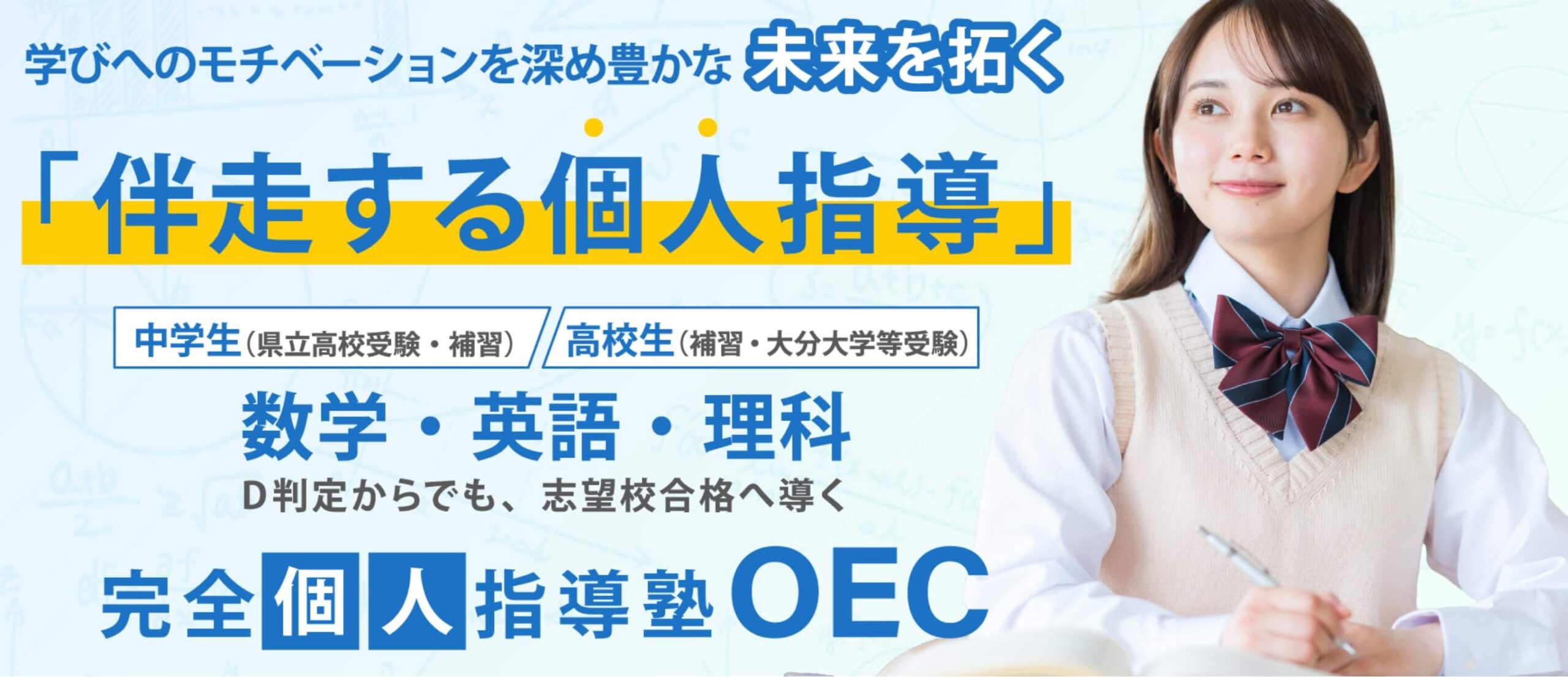 数学・英語・理科を中心に補習から受験対策まで、一人ひとりに合わせた戦略的学びのサービスで提供します。